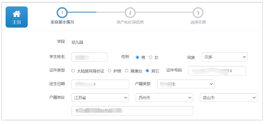 3.添加完子女基本信息后,点击“信息填报”进入填报页面。首先核对学生的基本信息,学生 信息无误后,选择学生所属民族,选择户籍类型(分为户籍生和非户籍生,请按真实情况勾选),填 写学生的户籍地址(需详细填写)。
