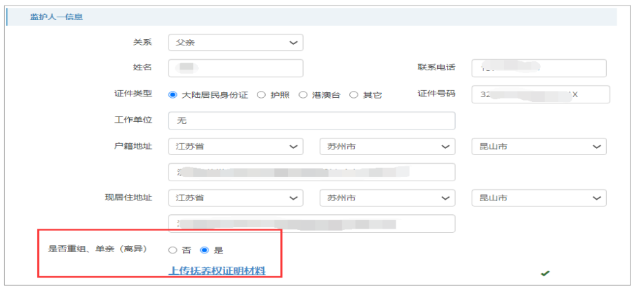 监护人分为监护人一和监护人二、没有顺序和先后之分,一般为小孩的父母。有第二监护人 的,则第二监护人必填,没有第二监护人的,在第二监护人关系栏勾选无。 若已有子女报名,待填写第二子女信息时,监护人信息不可更改。 监护人一下的是否重组、单亲(离异)系统默认选否。如果是重组、单亲(离异),请勾选 “是”并上传小孩的抚养权证明材料。