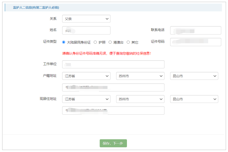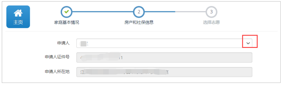 勾选申请人,系统自动加载填报过程中保留的监护人及监护人信息,选择好申请人后,申请人 的证件号和申请人所在地自动加载。