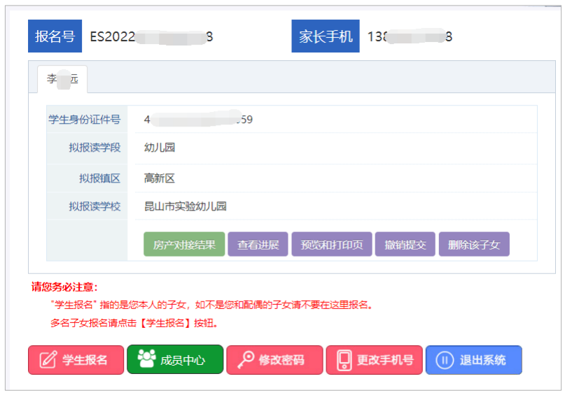 提交报名后,界面如下图所示,提交第二天可以查看系统自动对接的“房产对接结果”。 点击“预览和打印页”打印报名表并在申请人处签字。 提交报名后,如果发现填报信息有误,在拟报读学校审核前可以自行点击“撤销提交”按钮, 撤回修改,修改正确后,再次提交;拟报学校审核后需到拟报学校撤销并退回才能修改。