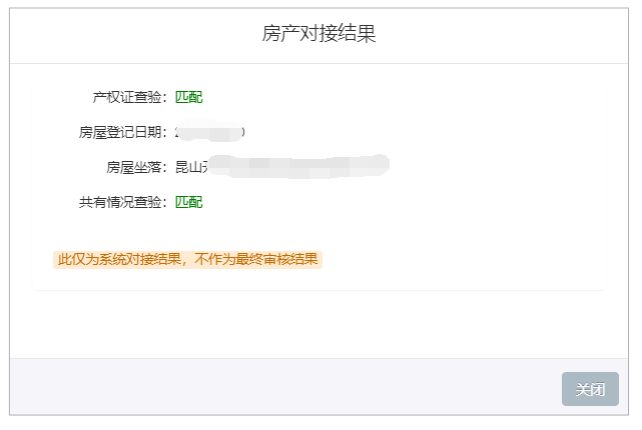 提交报名后第二天,点击“房产对接结果”可以查看系统自动对接结果。例如如下图所示,对 接结果供参考,以学校最终审核结果为准。