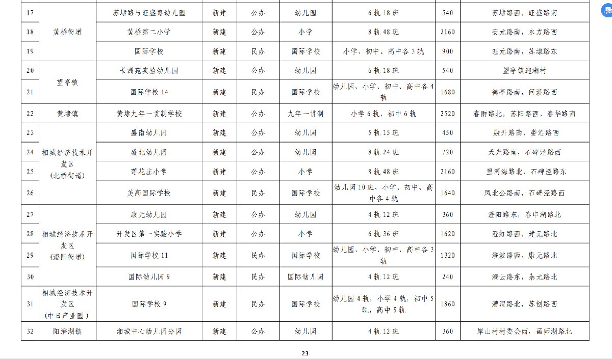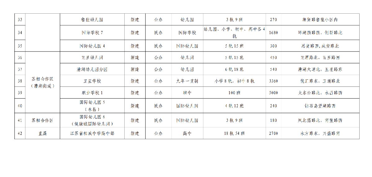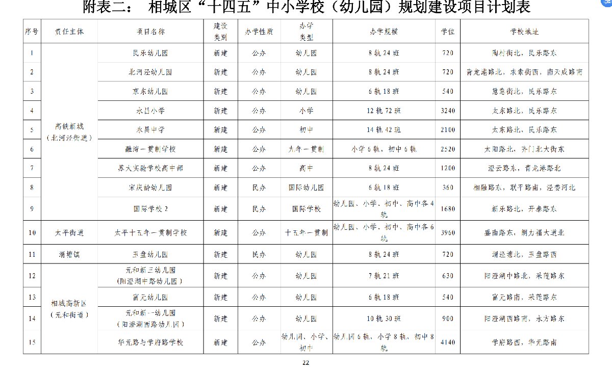 “十四五”期间,相城区规划新建学校42所,其中幼儿园16所,小学4所,初中1所, 高中2所,职业学校1所,一贯制学校6所,国际学校(幼儿园)12所。