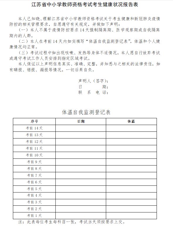 2021下半年江苏中小学教师资格考试考生健康状况报告表: