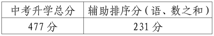 各初中学校分配指标分数线根据本校分配指标数确定,因校而异,但不低于全市分配指标最低控制线459分,并且考查科目合格。同校总分相同考生根据语文、数学成绩之和择优录取。