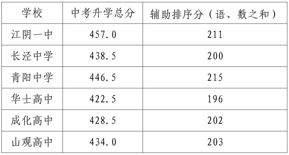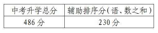 各初中学校分配指标分数线根据本校分配指标数确定,因校而异,但不低于全市分配指标最低控制线459分,并且考查科目合格。同校总分相同考生根据语文、数学成绩之和择优录取。