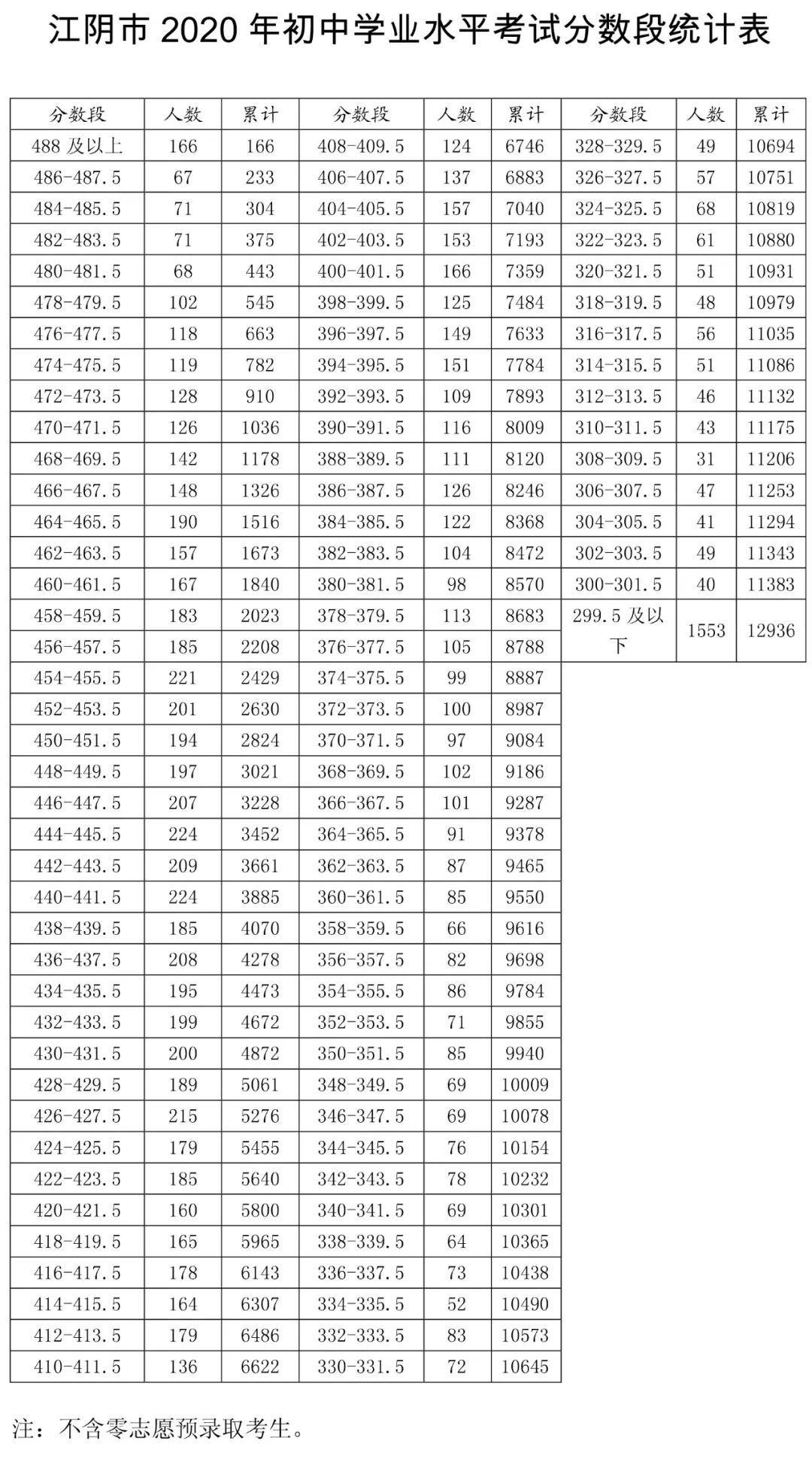 2020年中考各分数段人数488分及以上共166人;450分及以上共2824人;400分及以上7359人