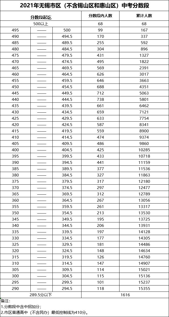2020年无锡市区(不含锡山区和惠山区)中考分数段