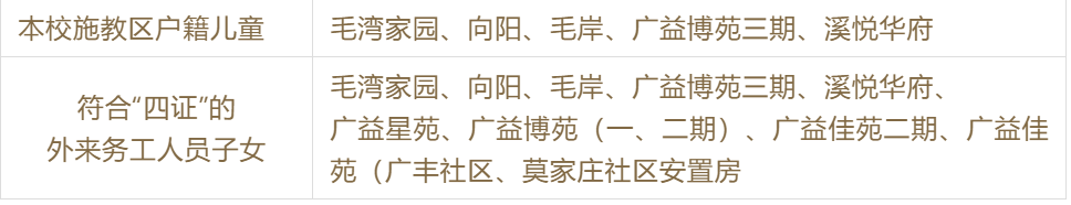 1.施教区户籍儿童:适龄儿童具有施教区正式户籍,适龄儿童户籍原则上应与监护人相同,且户籍与监护人房屋产权证、实际常住地三者相符,同时必须在6月1日前在施教区具有一年及以上正式户籍、房屋产权证,并实际居住满一年。入学矛盾突出的学校施教区内一户地址六年内只享有一次对口入学机会(符合计划生育政策的非独生子女家庭除外)。