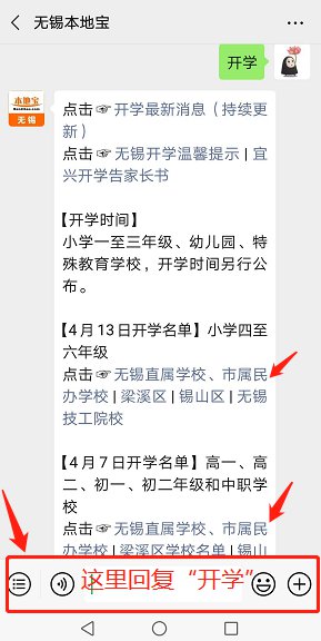 更多开学名单、最新消息:微信搜索公众号“无锡本地宝”,在聊天框回复“开学”,查询无锡开学时间,开学学校名单等;分别回复“幼儿园”、“小学”、“初中”,查询无锡幼儿园、小学、初中招生政策,学区划分等;回复【XX小学/幼儿园】(如“堰桥幼儿园”、“连元街小学”)即可查询该学校招生公告。