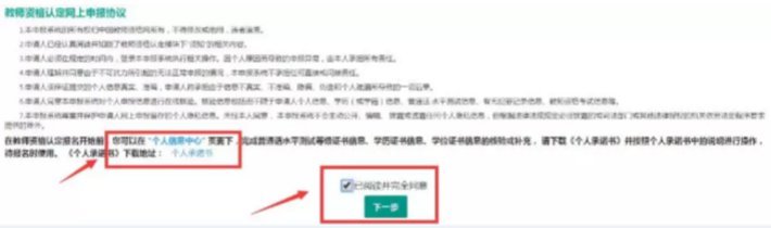 7、点击页面右上角[教师资格认定]如下界面:点击[个人承诺书]下载打印,并签字填写日期,留存拍照片,等待上传。