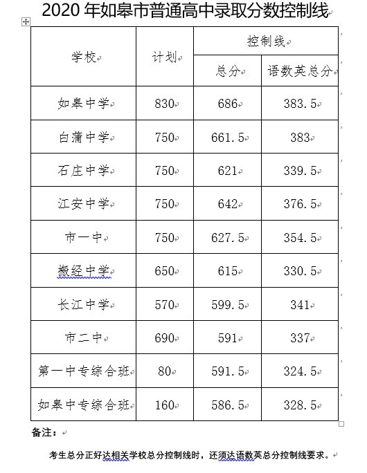2020年南通如皋市各高中中考录取分数线