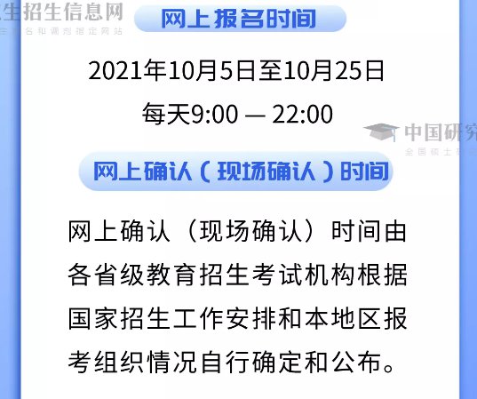 全国硕士研究生招生考试报名包括网上报名和网上确认(现场确认)两个阶段。网上报名工作安排在10月5日至10月25日(每天9:00-22:00),预报名工作安排在9月24日至9月27日(每天9:00—22:00)。所有参加全国硕士研究生招生考试的考生均应当按照有关省级教育招生考试机构的规定,在其指定的报考点办理网上报名和网上确认(现场确认)手续。