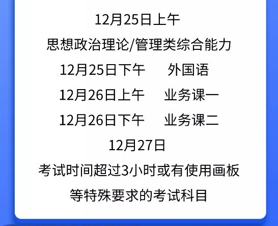 2022年全国硕士研究生招生考试初试定于2021年12月25日至26日,考试时间超过3小时或有使用画板等特殊要求的少数考试科目安排在12月27日。