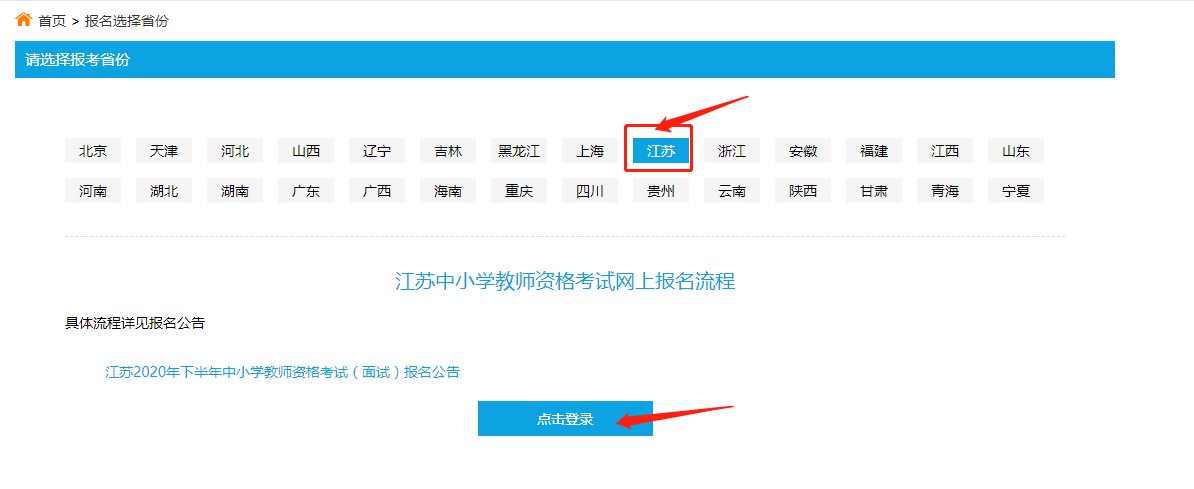 第一步:教师资格证面试缴费需要登录“中小学教师资格考试网”,点击“报名系统”,选择好你一开始报名的时候选择的省份,单击“点击登录”按钮: