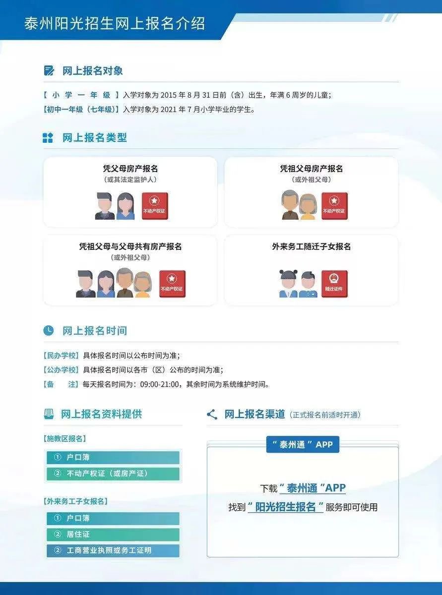 2021年泰州各市(区)义务教育学校招生报名将于7月中旬陆续开始。根据省、市相关文件精神要求,今年全市各义务教育学校将继续通过“泰州市网上阳光招生平台”实行公办和民办学校同步招生。