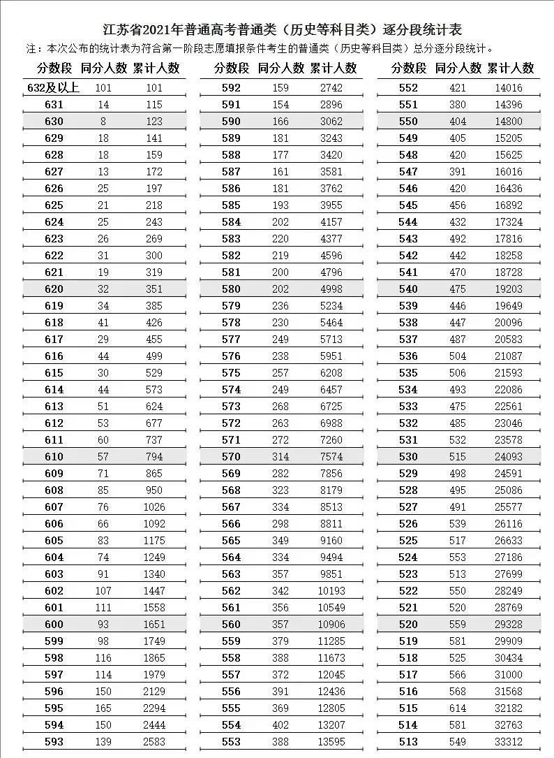 (1)江苏省2021年普通类高考普通类(历史等科目类)逐分段统计表: