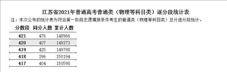 (2)江苏省2021年普通类高考普通类(物理等科目类)逐分段统计表: