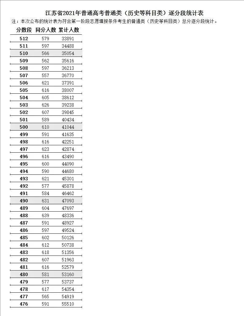 (1)江苏省2021年普通高考普通类(历史等科目类)逐分段统计表: