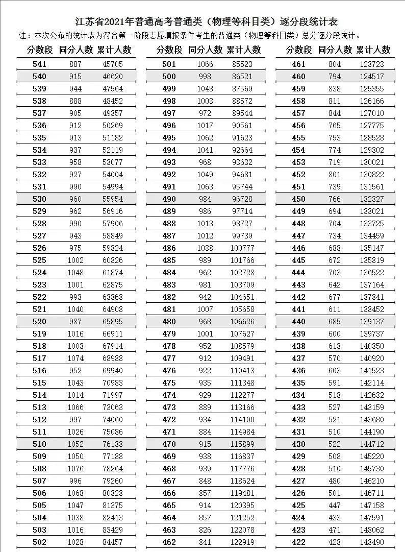 (2)江苏省2021年普通高考普通类(物理等科目类)组分段统计表: