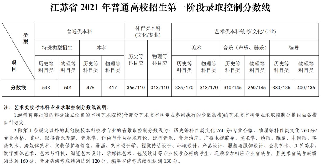 2021江苏省普通高校招生第一阶段省录取控制分数线