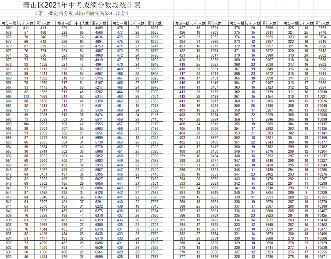 根据今年的分数段统计表显示,2021年萧山中考第一批定向分配录取控制分为534.75分;其中,580分及以上的考生有411人,535分及以上的考生有4126人。