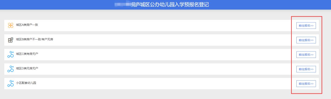 进入学生类型选择页面,根据招生政策及个人情况,选择对应的学生类型,点击“前往报名”。以城区公办幼儿园为例: