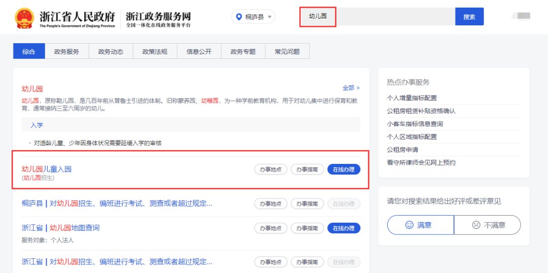 方法1:在输入框内输入“幼儿园 ”,进行搜索,找到“桐庐县丨幼儿园儿童入园”,点击“在线办理 ”按钮。