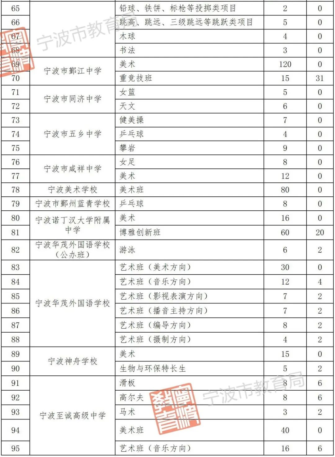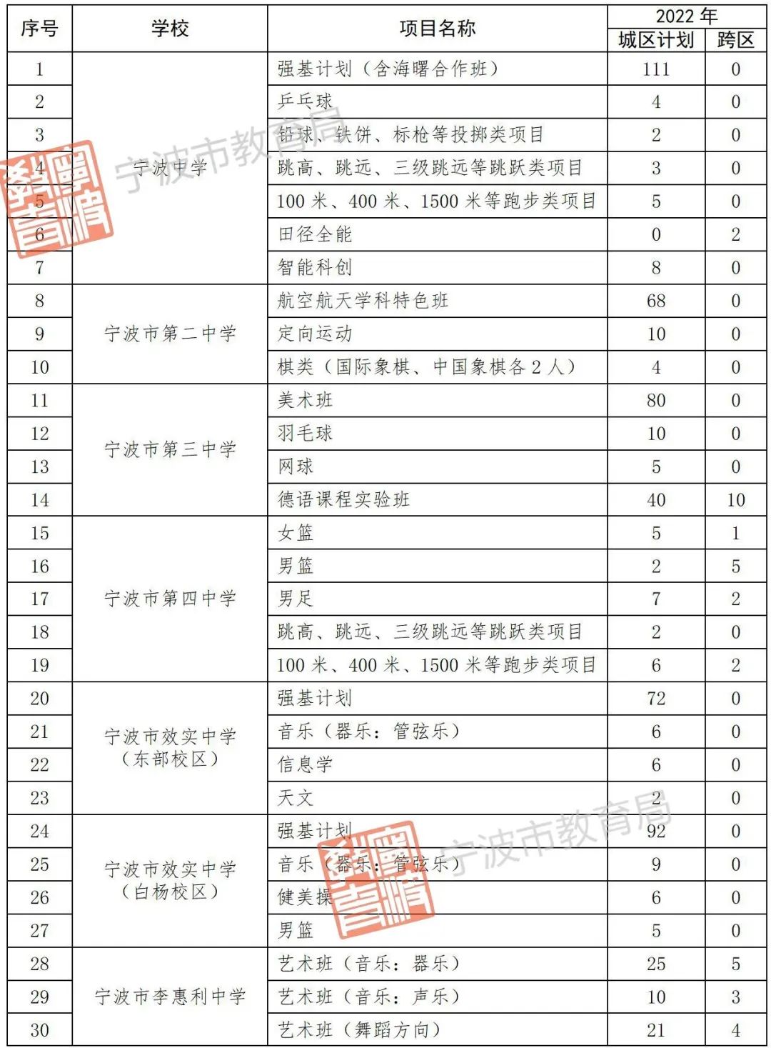 2022年宁波市普通高中城区自主招生计划表