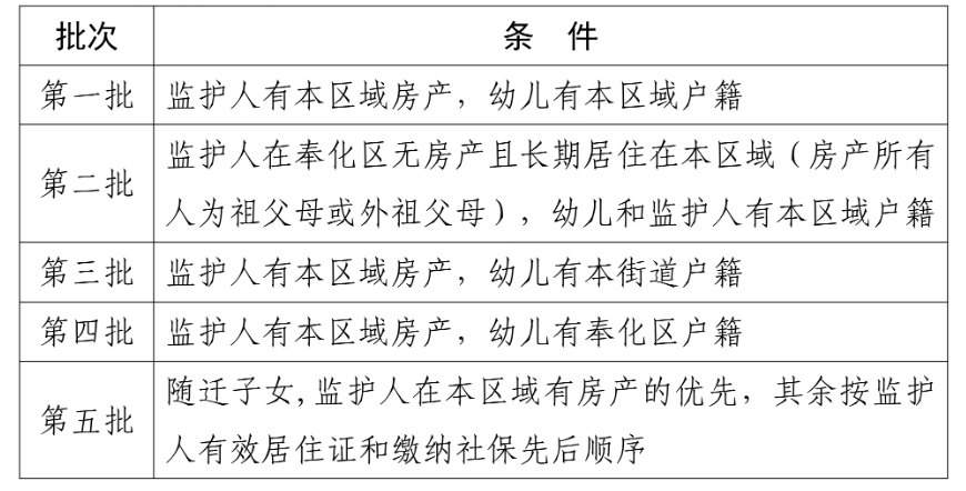 ⑵实际居住地优先。监护人房产和幼儿户籍没有同时具备的,先录取监护人在奉化区无房产且长期居住在本区域(房产所有人为祖父母或外祖父母),幼儿和监护人有本区域户籍的;再录取监护人房产在本区域,幼儿有本镇(街道)户籍的;最后录取监护人房产在本区域,幼儿有奉化区户籍的。若同一批次内无法全部录取时,按幼儿落户时间先后顺序录取。