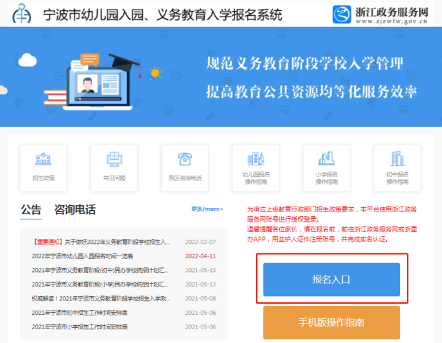 报名入口:浙江政务服务网“宁波市幼儿园入园、义务教育入学报名招生系统”
