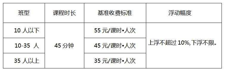 (二)具体收费标准各培训机构在基准收费标准和浮动幅度内,确定具体收费标准。标准课程时长为45分钟,实际时长不一样的,按比例折算。