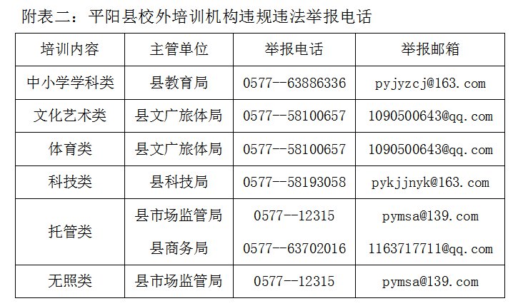 我县对校外培训机构治理建立了联防联控机制,巡查督查力度持续加大,依法依规严厉打击学科类机构转入“地下”、非学科类培训机构从事学科类培训以及无证无照经营等违规办学行为。如发现违规或疫情防控不到位机构请积极向所在乡镇或主管部门举报(举报电话详见附表二)。