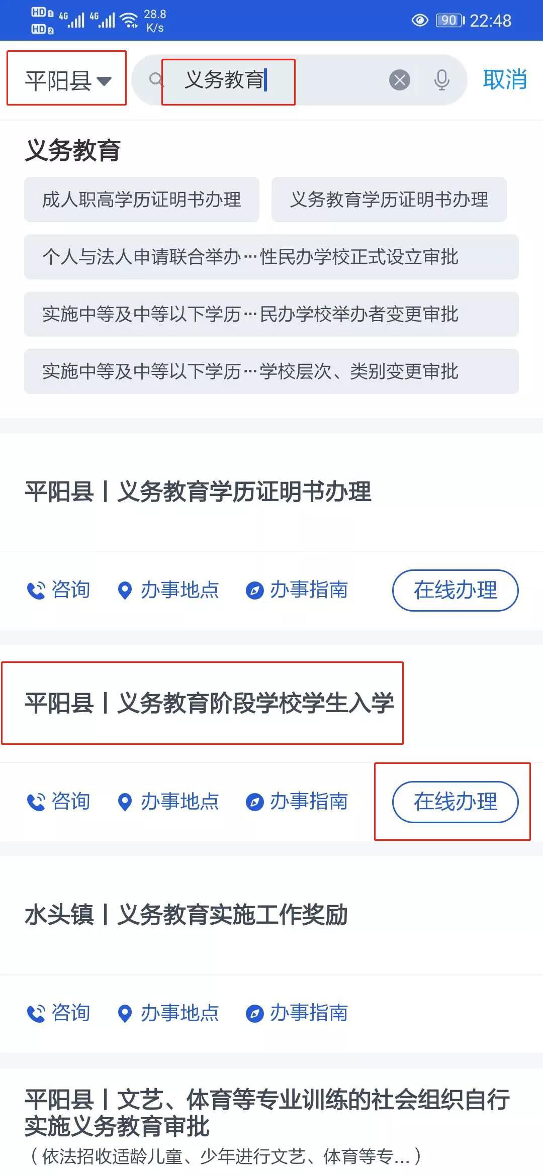 第二步:6月1日开始,家长用经绑定关联的手机号进入浙里办APP,定位“平阳县”,查找“义务教育”,在“平阳县|义务教育阶段学校学生入学”项点击“在线办理”。
