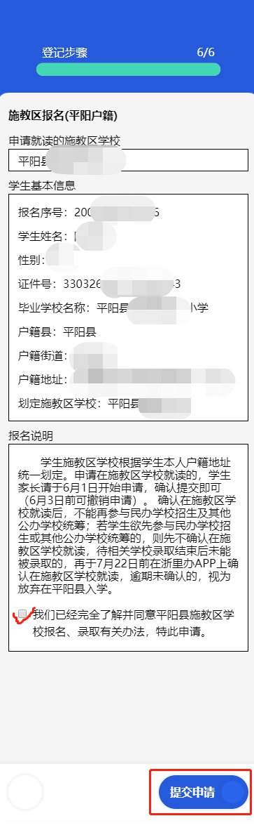 第八步:查阅施教区学校、学生基本信息及报名说明,确认无误后,勾选“知情同意”,再提交申请。