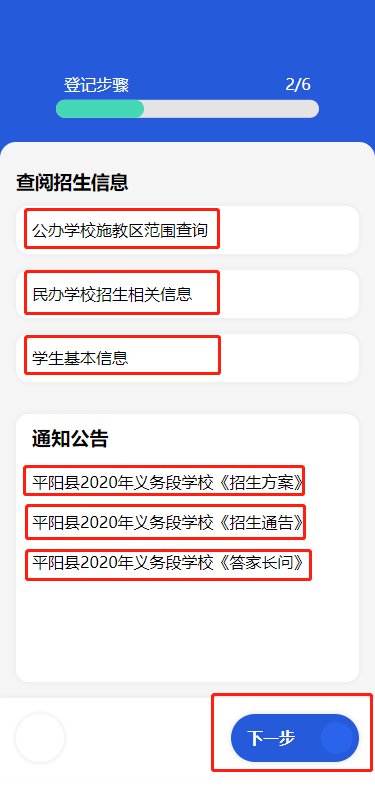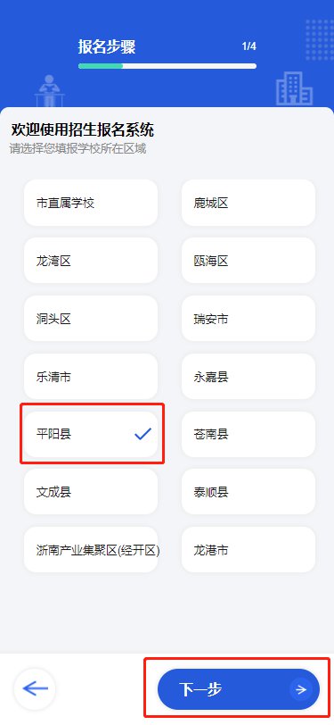 第五步:在平阳县招生主页,既查阅我县公办学校施教区范围、民办学校招生相关信息、学生基本信息,也可以查阅《招生方案》《招生通告》《答家长问》。请各位家长在报名前详细阅读相关材料,认真了解我县招生政策与办法。阅读完毕后,点击“下一步”开始报名。