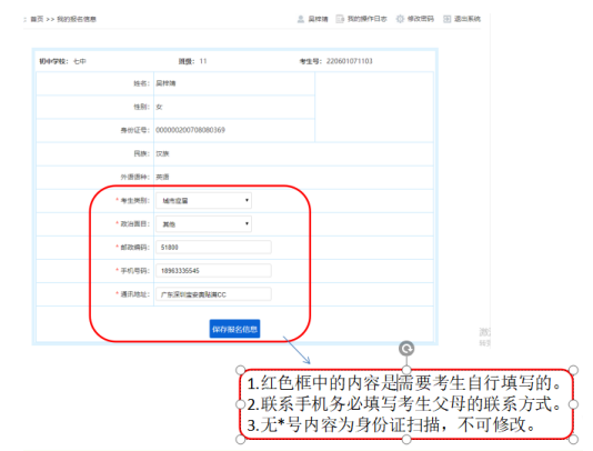 五、补充完善个人信息。无星号框内为采集的身份证信息,不可修改。考生须在红色星号框内补充完善个人信息, 包括“考生类别”、“政治面目”、“邮政编码”、“手机号码”、“通讯地址”,填写完成后点击“保存报名信息”。