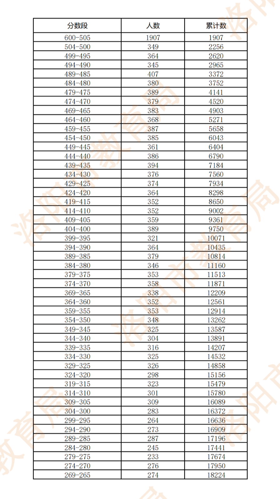 2022洛阳市初三学生模拟考试已经结束,本次参与一模学生共25389人,为便于广大考生填报志愿,市教育局将本次模拟考试市区内学生分数分布情况公布如下(仅供参考):
