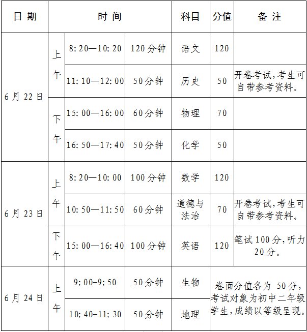全省统一命题考试的科目为语文、数学、英语、物理、化学、道德与法治、历史、生物、地理。生物、地理学科为初中二年级考试科目,成绩原则上以A、B、C、D四个等级呈现,其中D等不超过5%,具体等级划分比例和使用办法由各省辖市、省直管县(市)制定。英语听力考试采用光盘播放,各考点要统一配备相关设备。为统筹做好高考分数公布、高招及疫情防控工作,今年中招考试时间为6月22日-24日,具体科目考试时间和分值见下方《2022年河南省普通高中招生考试方案》↓↓↓