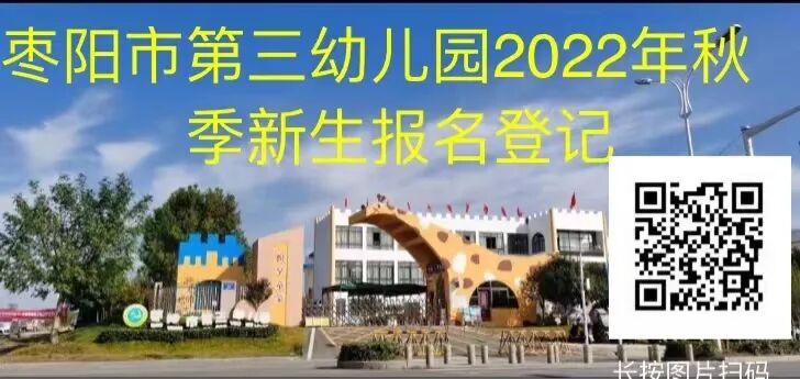 枣阳市第三幼儿园2022年秋季新生幼儿信息登记开始啦!有意向报名的家长,均可通过微信扫描二维码在网上填报、提交幼儿基本信息。幼儿园网上初审通过后,会根据您提交信息时预留的手机号跟您联系,提示您完成后续事项。