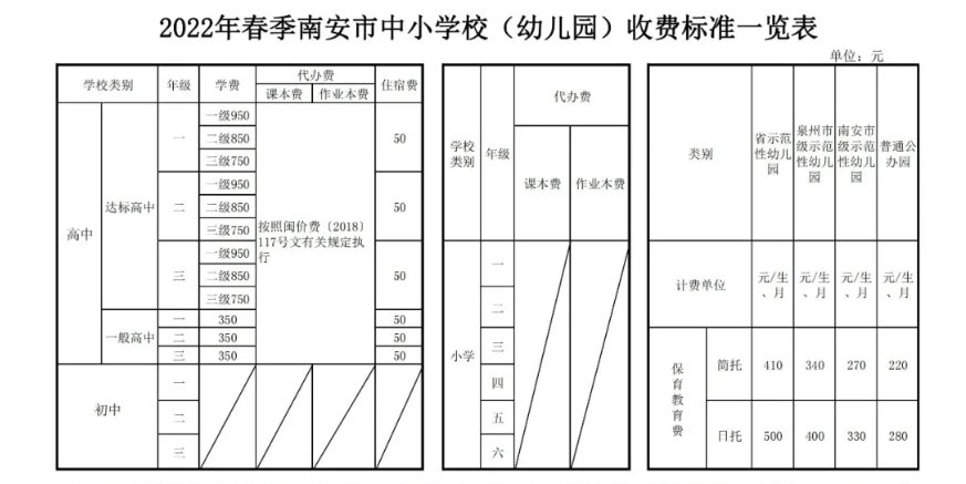 2022年春季南安市中小学校(幼儿园)收费标准公布