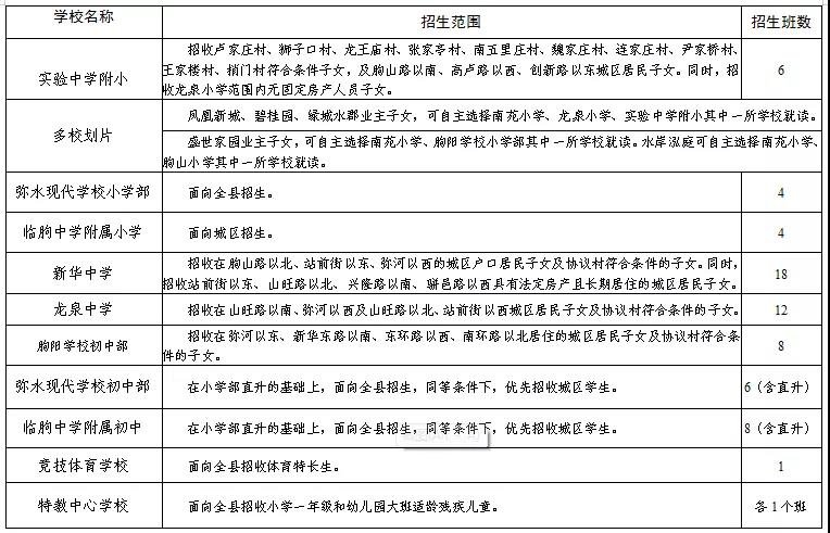 各城区学校依据上述指导性批次,制定本校的具体招生批次,并报县教体局备案后组织实施。受办学规模及破解大班额需要,新华中学、实验一小、实验二小、龙泉小学暂不接收无固定房产人员子女。城关街道、东城街道所属义务教育学校,除承担本街道招生任务外,应积极接收外来务工人员子女。