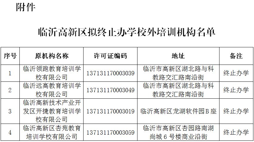 根据中共中央办公厅、国务院办公厅《关于进一步减轻义务教育阶段学生作业负担和校外培训负担的意见》(中办发〔2021〕40号)、教育部办公厅等三部门《关于将面向义务教育阶段学生的学科类校外培训机构统一登记为非营利性机构的通知》(教监管厅〔2021〕1号)、《中华人民共和国民办教育促进法》《中华人民共和国行政许可法》、临沂市教育局等4部门《关于将学科类校外培训机构统一登记为非营利性机构的通知》(临教职字〔2021〕20号)等有关规定,临沂领跑教育培训学校有限公司等4家校外培训机构经董事会决议通过,向临沂高新区行政审批服务局提交终止办学申请,经审核,拟准予终止办学并注销许可,现予以公示(名单附后)。