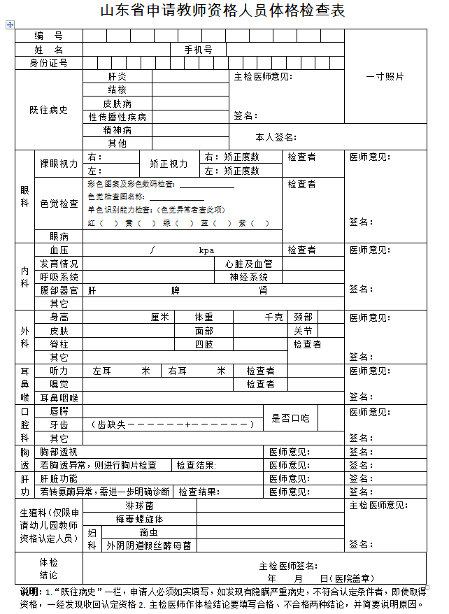 点此下载:山东省申请教师资格人员体格检查表和威海指定体检医院