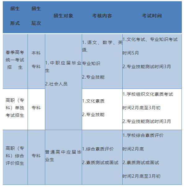 注:考核内容中“专业技能”均指全省春季高考统一考试招生技能测试。参加单独考试招生的退役士兵参加由学校组织的素质测试或面试。