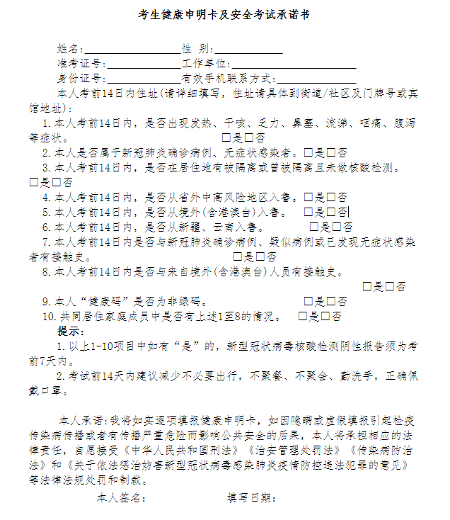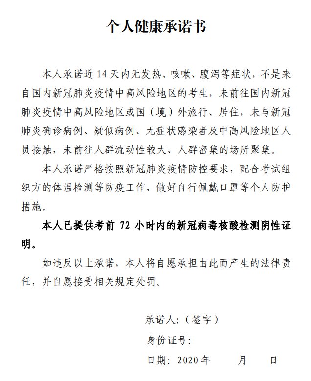 考生自考前14天起,每天采取自查自报方式进行健康监测,考前一天填写《考生健康申明卡及安全考试承诺书》。瞒报、虚报个人旅居史和健康症状的,将依法依规予以处理。考生须在考前14天通过微信搜索“山东电子健康通行卡”,或支付宝首页搜索“山东电子健康通行卡”申领山东省健康通行码。