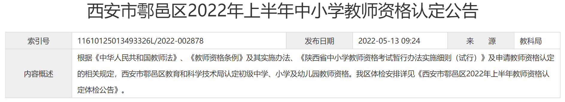 根据《中华人民共和国教师法》、《教师资格条例》及其实施办法、《陕西省中小学教师资格考试暂行办法实施细则(试行)》及申请教师资格认定的相关规定,西安市鄠邑区教育和科学技术局认定初级中学、小学及幼儿园教师资格。现将2022年上半年初级中学、小学及幼儿园教师资格认定工作公告如下: