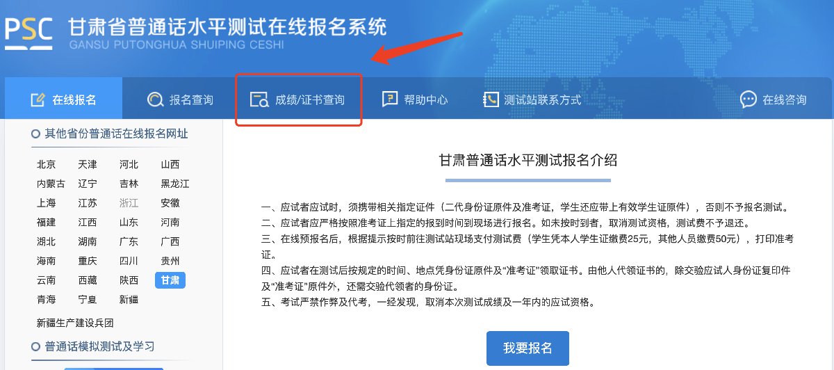 第一步:进入网上查询入口,选择“甘肃”,点击“打印准考证”