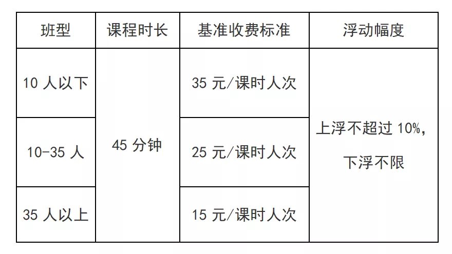 全市线下学科类校外培训基准收费标准和浮动幅度:10人以下班型为35元/课时人次,10-35人班型为25元/课时人次,35人以上班型为15元/课时人次。每课时45分钟,实际时长不一样的,按比例折算。各校外培训机构可在此基础上适当上浮,上浮幅度不得超过10%,下浮不限。