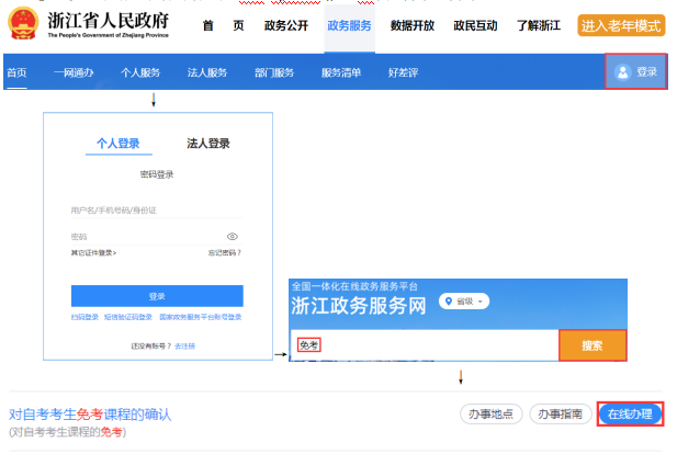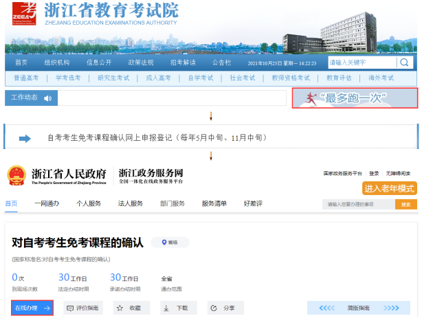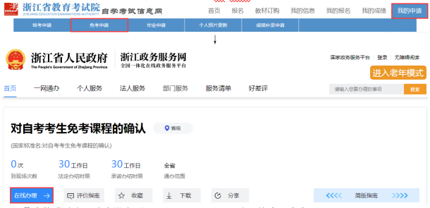 考生个人信息、课程成绩信息经查核或更正无误后,通过浙江政务服务网或浙里办APP进行免考申请登记。