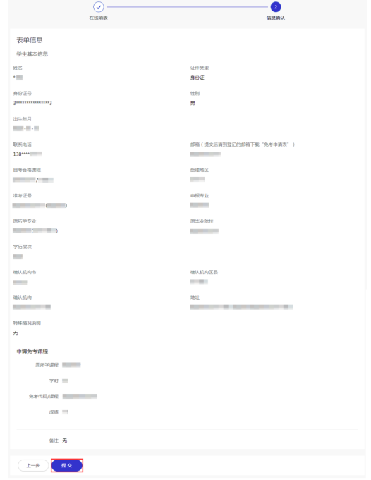 务必保证所填内容的正确,特别是准考证号的选择、课程以及用于接收《浙江省高等教育自学考试免考申请表》的邮箱等。如填错,返回“上一步”修改。确认无误后“提交”。